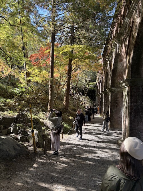 明治時代のレンガ造りの水道橋。紅葉とのコントラストが美しく、記念写真スポットとしてもおすすめです。
